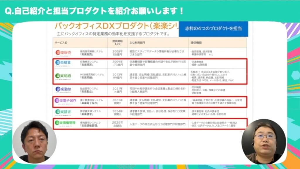 楽楽精算は2009年提供開始の15年以上の歴史ある製品である一方、楽楽電子保存や楽楽債権管理はこの2年ほどで立ち上がった新しい製品です。ざっくり言うと、会計システム領域に最終的につながる4製品を担当しています。